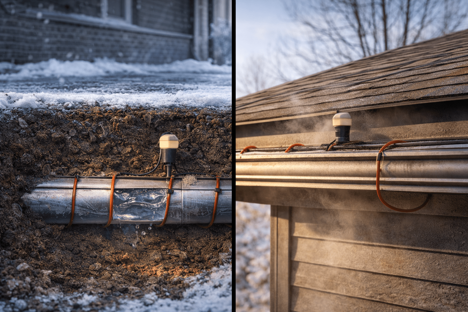 Логика простая: труба замерзает при падении температуры. Достаточно одного датчика температуры с уставкой +3…+5°C. Датчик осадков не нужен — погода тут не при чём.