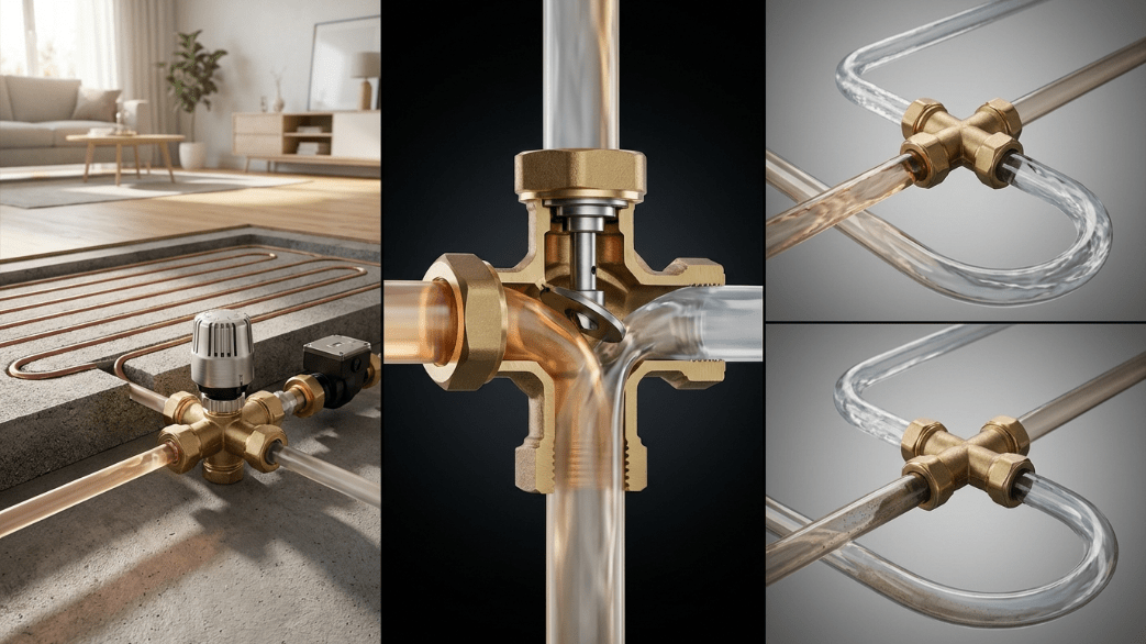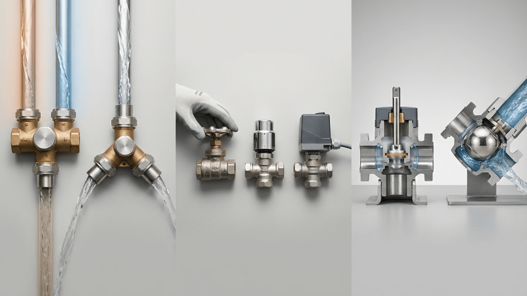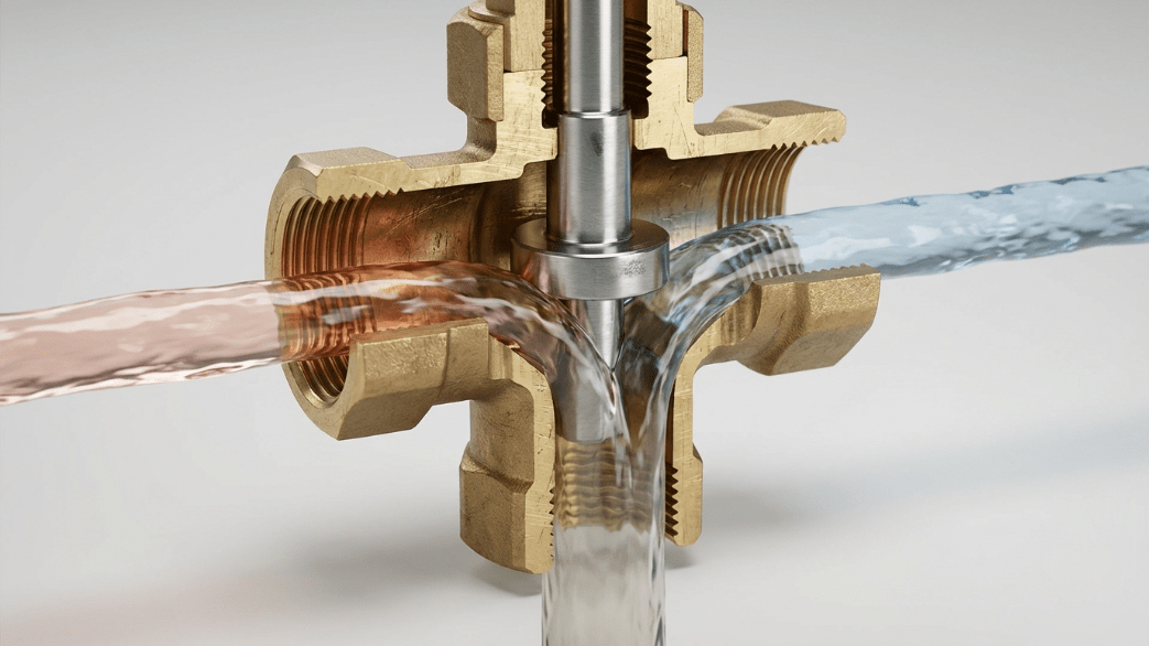 Трехходовой клапан представляет собой инженерный тройник с внутренним регулирующим механизмом, имеющий три рабочих патрубка. Его главная задача — смешивать горячий и остывший потоки для получения нужной температуры или разделять один поток на два независимых направления. За счет изменения положения внутреннего штока устройство максимально точно дозирует объем воды, поступающей из разных контуров.